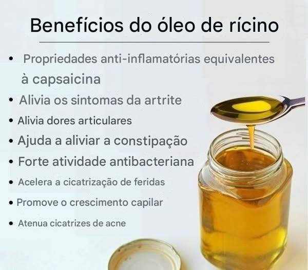 O óleo de rícino não serve apenas para a beleza externa — ele também é um poderoso aliado no alívio de dores musculares e articulares. O ácido ricinoleico presente no óleo de rícino possui fortes propriedades anti-inflamatórias que podem reduzir o inchaço e aliviar o desconforto causado por condições como artrite, entorses ou rigidez em geral.