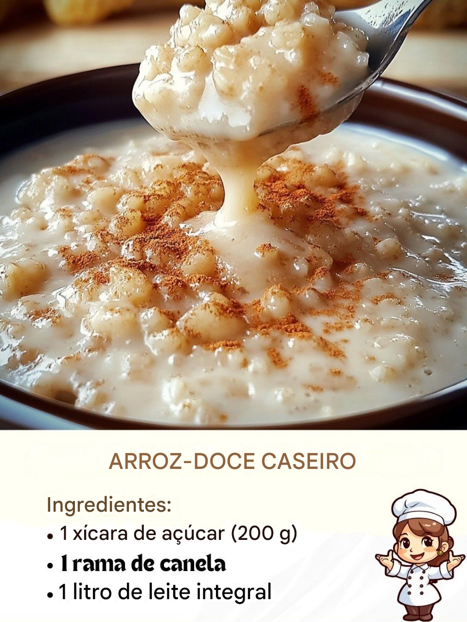 Nesta receita de arroz doce, o preparo combina ingredientes básicos, resultando em um prato saboroso. Através do cozimento lento em leite aromatizado com canela e cítricos, o arroz absorve os sabores e cria uma mistura suave e cremosa, ideal para ser apreciada quente ou fria.