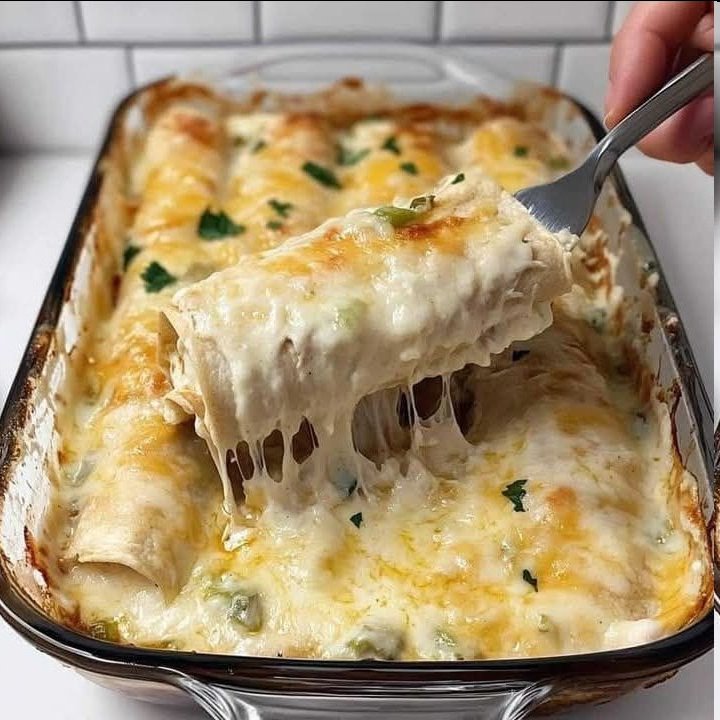 Aqui está uma receita de enchiladas de frango cremosas, saborosas e incrivelmente satisfatórias. Essas enchiladas são feitas com frango macio envolto em tortilhas macias, banhadas em um molho branco rico e cremoso preparado com creme de leite, pimentas verdes e queijo derretido. Assadas até dourar e borbulhar, elas são perfeitas para o jantar ou até mesmo para um encontro com a família e os amigos.