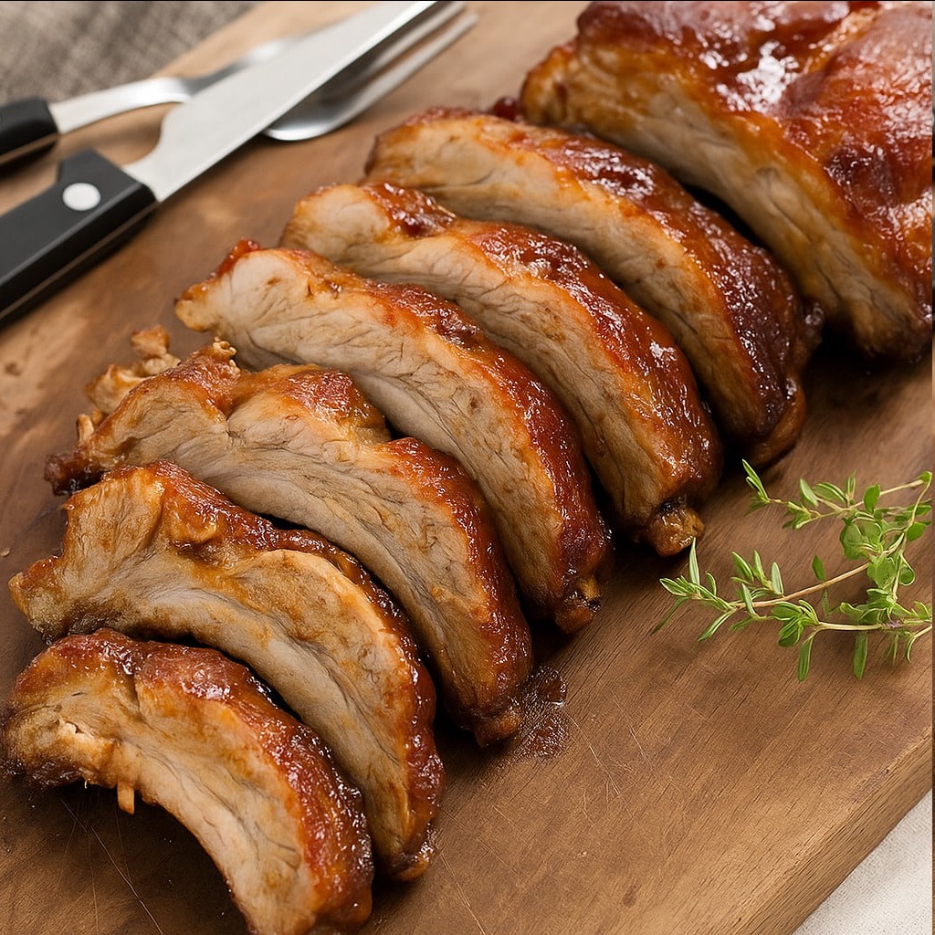 O segredo está na marinada aromática e no cozimento com líquido , o que permite que as costelas fiquem macias e cheias de sabor, enquanto a pele adquire um irresistível tom dourado claro.