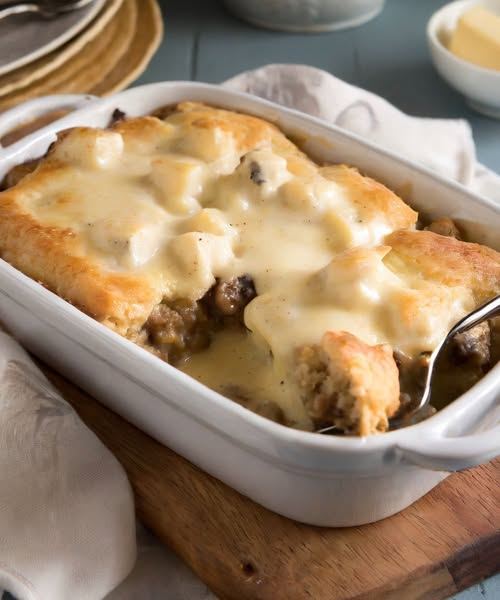 Esta reconfortante e completa versão de um tradicional café da manhã do sul dos Estados Unidos assa biscoitos fofinhos em um cremoso molho de linguiça caseiro.