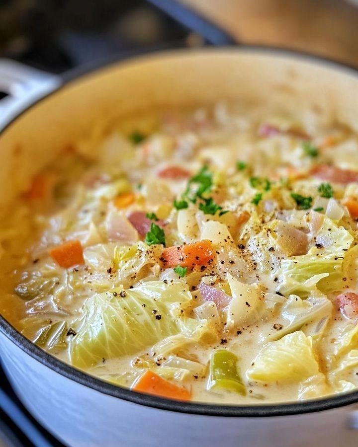 Esta sopa cremosa de repolho ao estilo sulista é um prato reconfortante e surpreendentemente rico. Os sabores simples do repolho tenro, da cebola e do alho são cozidos em fogo brando num caldo saboroso, e depois realçados com creme de leite fresco e um toque de páprica defumada, resultando numa refeição maravilhosamente suave, quente e satisfatória.