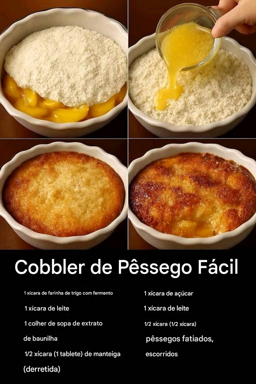 Ao contrário das tortas tradicionais que exigem misturar massa, abrir a massa folhada ou dispor as frutas em camadas, esta versão é incrivelmente simples. O segredo? Basta despejar a massa na forma, adicionar os pêssegos por cima e deixar o forno fazer o trabalho. Enquanto assa, a massa cresce ao redor dos pêssegos, criando uma crosta macia, semelhante à de um bolo, com bordas douradas e crocantes. É o tipo de sobremesa que você pode preparar em minutos com ingredientes básicos da despensa.