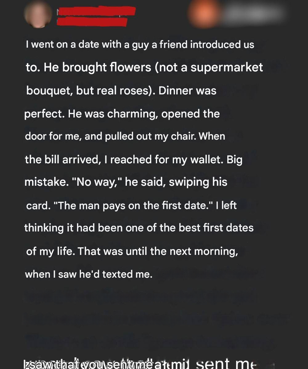Quando Eric me pediu para pagar nosso primeiro encontro, pensei ter conhecido um verdadeiro aristocrata. Rosas, um belo presente, uma conversa interessante… ele tinha tudo planejado. Quando ele me escreveu no dia seguinte, eu esperava uma mensagem agradável, mas ao lê-la, meu sangue gelou.
