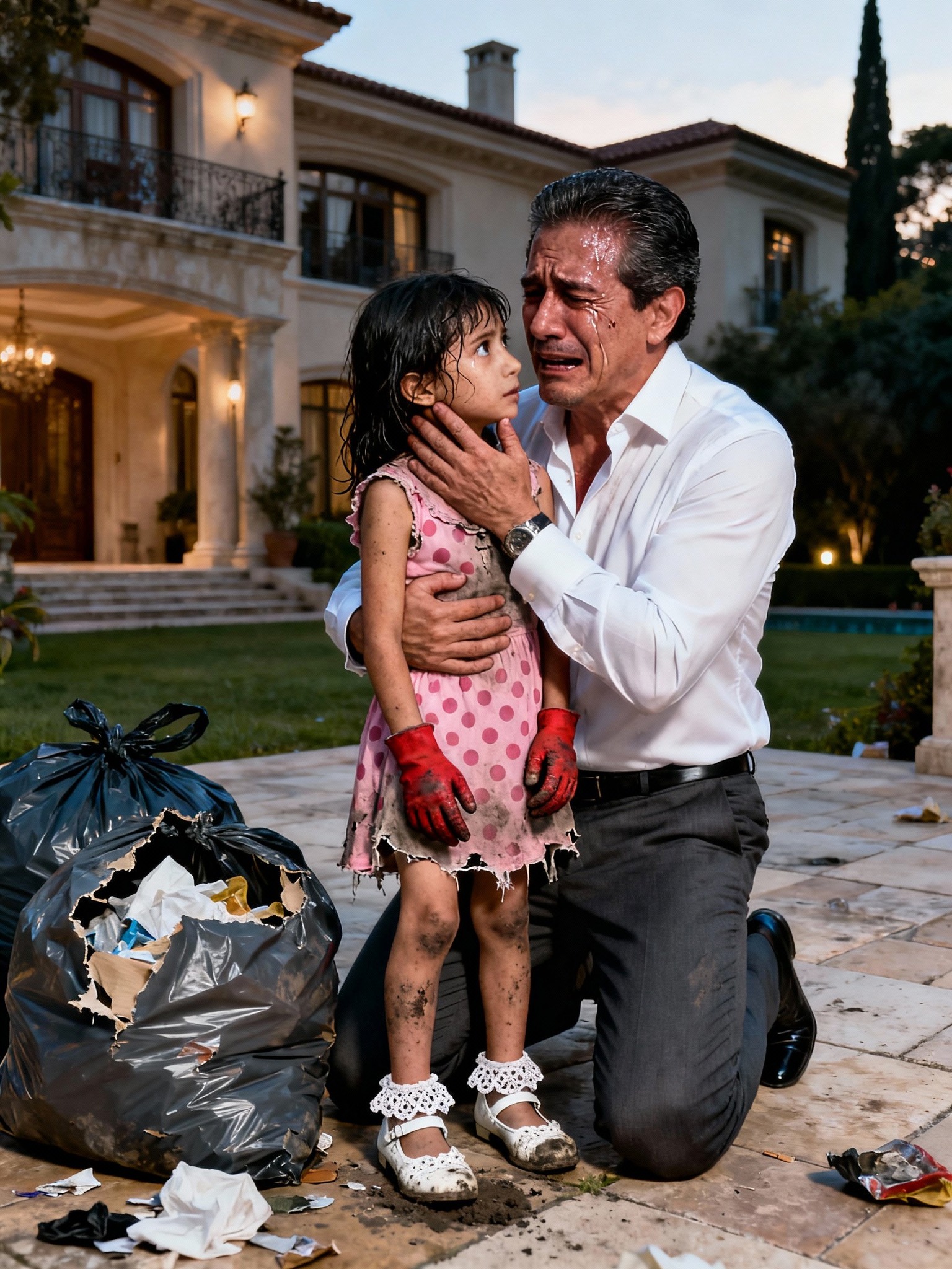 "Pai... você chegou cedo em casa. Você não deveria me ver assim. Por favor, não fique bravo com ela."