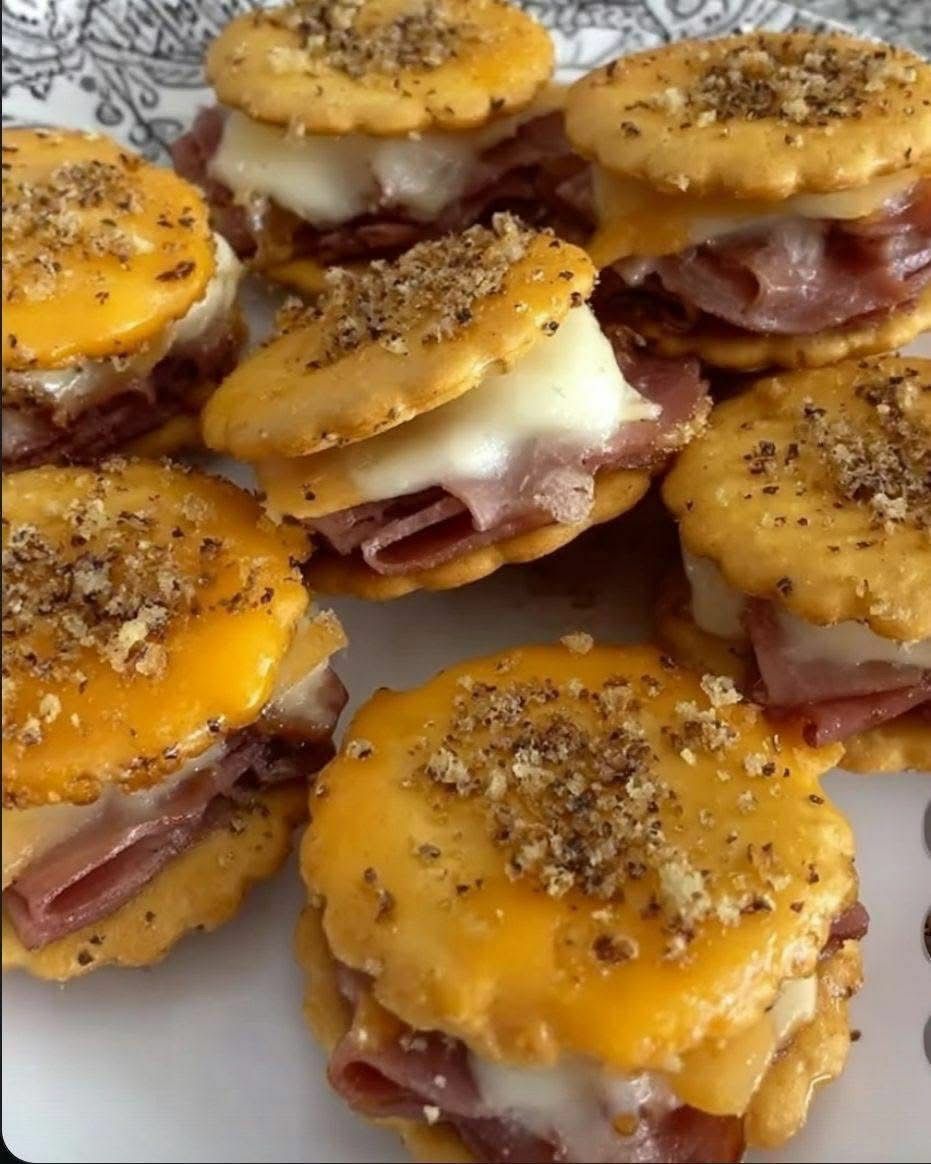 Delicie-se com o sabor irresistível dos Sanduíches de Biscoito Ritz para Festa! Essas iguarias capturam a essência dos amados mini-sanduíches de presunto, com camadas de presunto fatiado e queijo suíço entre dois biscoitos Ritz. Antes de serem assados à perfeição, uma mistura saborosa de molho inglês, mostarda Dijon, manteiga derretida, cebola em pó e sementes de papoula é generosamente regada sobre os sanduíches. Acredite, estes são, sem dúvida, os melhores aperitivos que você já provou!