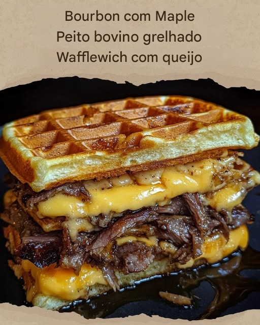 Uma versão ousada da comida reconfortante, este Wafflewich com Queijo Grelhado de Brisket ao Bourbon e Maple combina doce, defumado e saboroso em cada mordida. Brisket macio, cozido lentamente em bourbon e xarope de bordo, é coberto com queijo cheddar derretido, grelhado entre fatias de pão amanteigado e, por fim, prensado entre waffles. Sim, é tão incrível quanto parece.